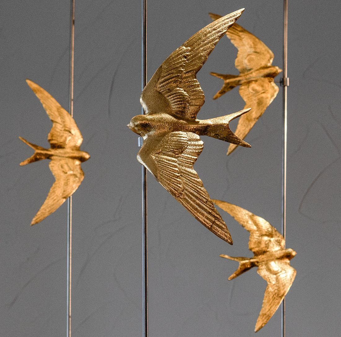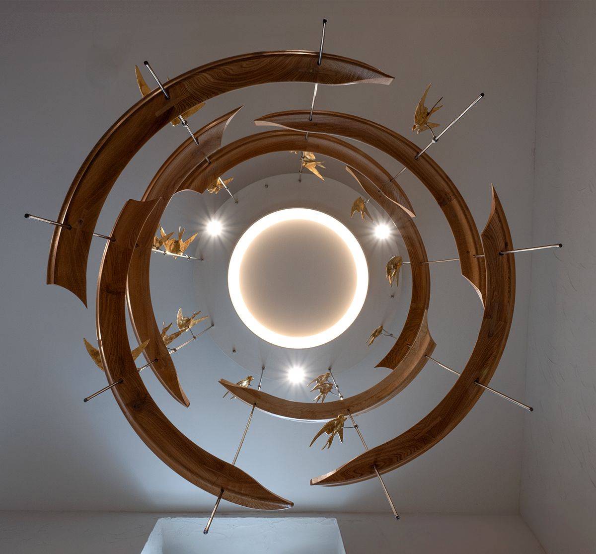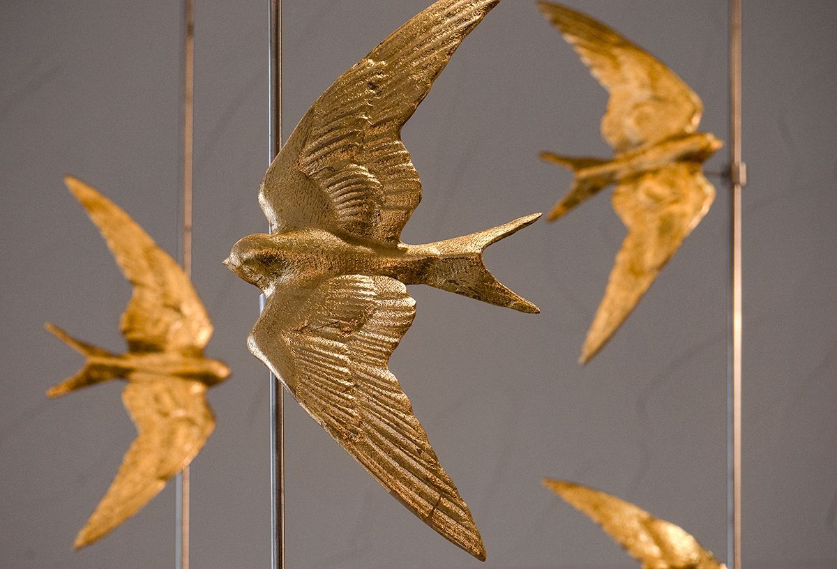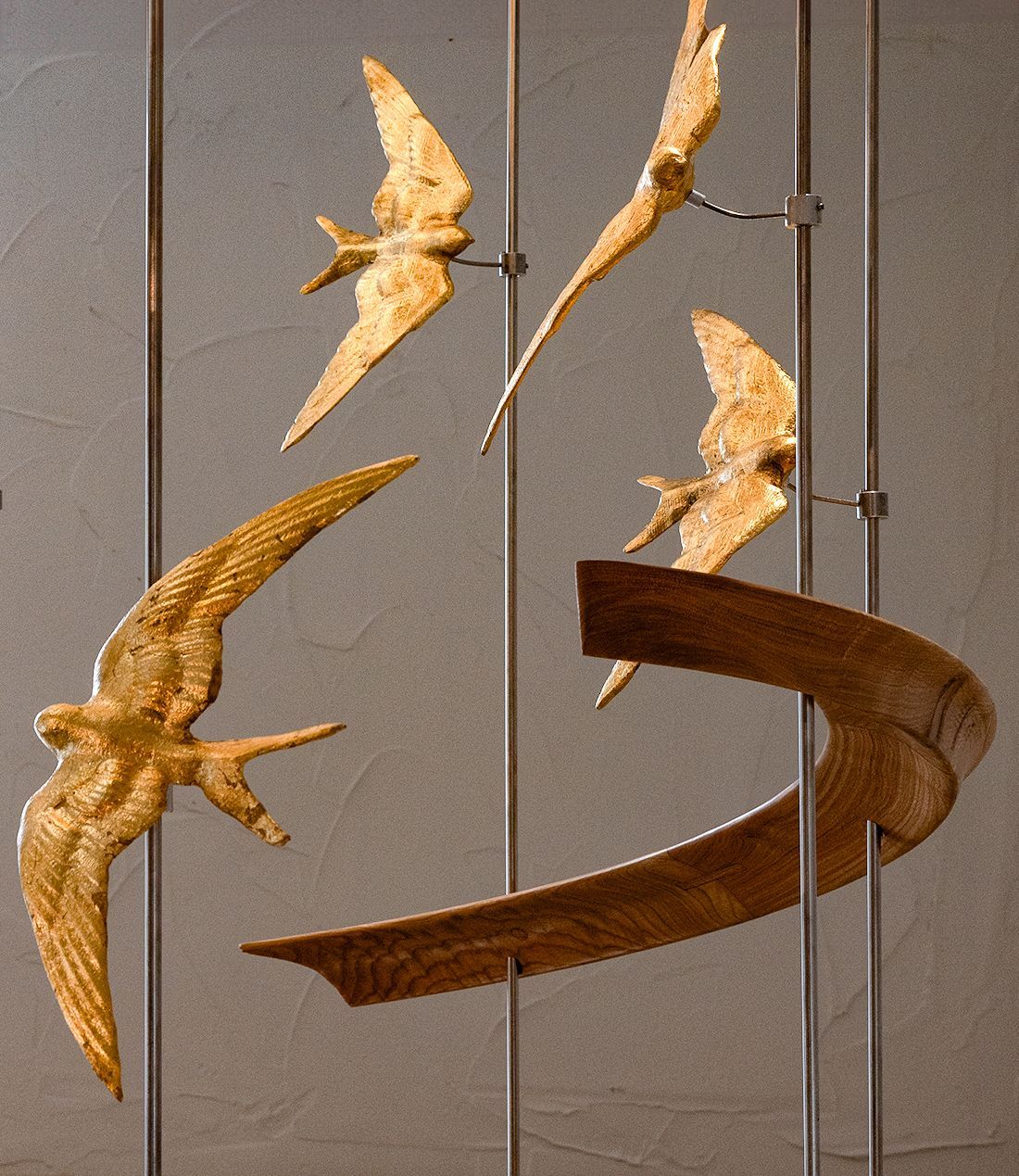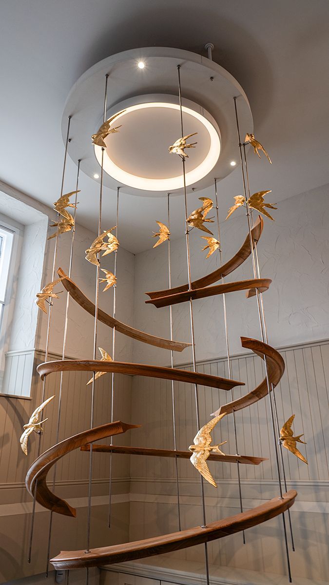 In this sculpture the gold gilded wooden swallows, carved and sourced from local woodlands, display a common unity of purpose. We are directed by the swallow’s glittering upward voltage and pattern of flight, an uplift, towards a revelation of wonder, a type of directional-grace, towards light, and the joy of new beginnings.