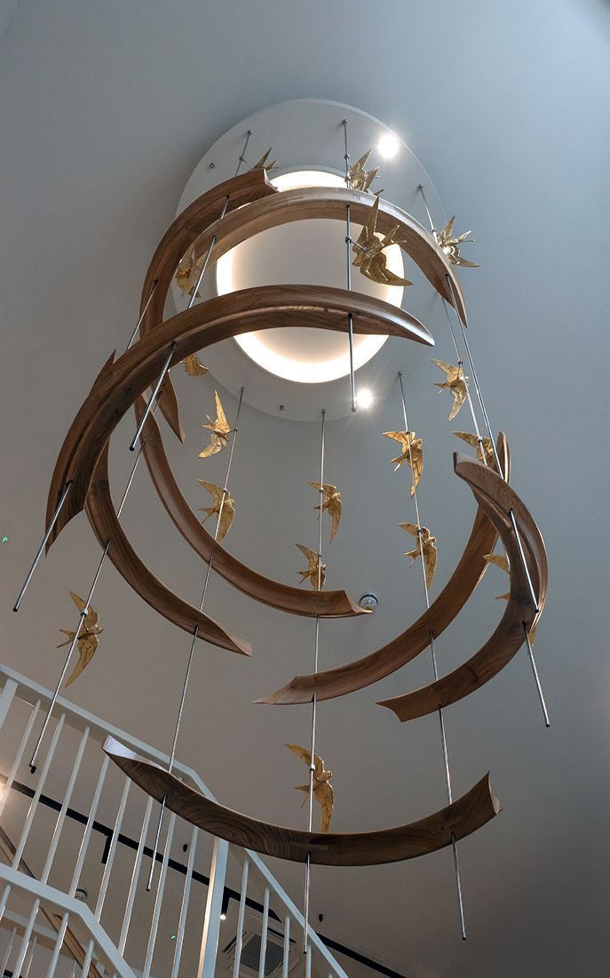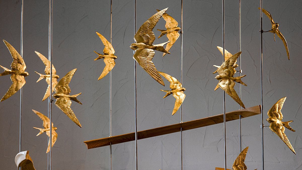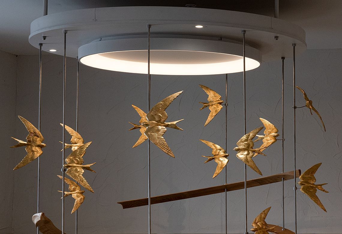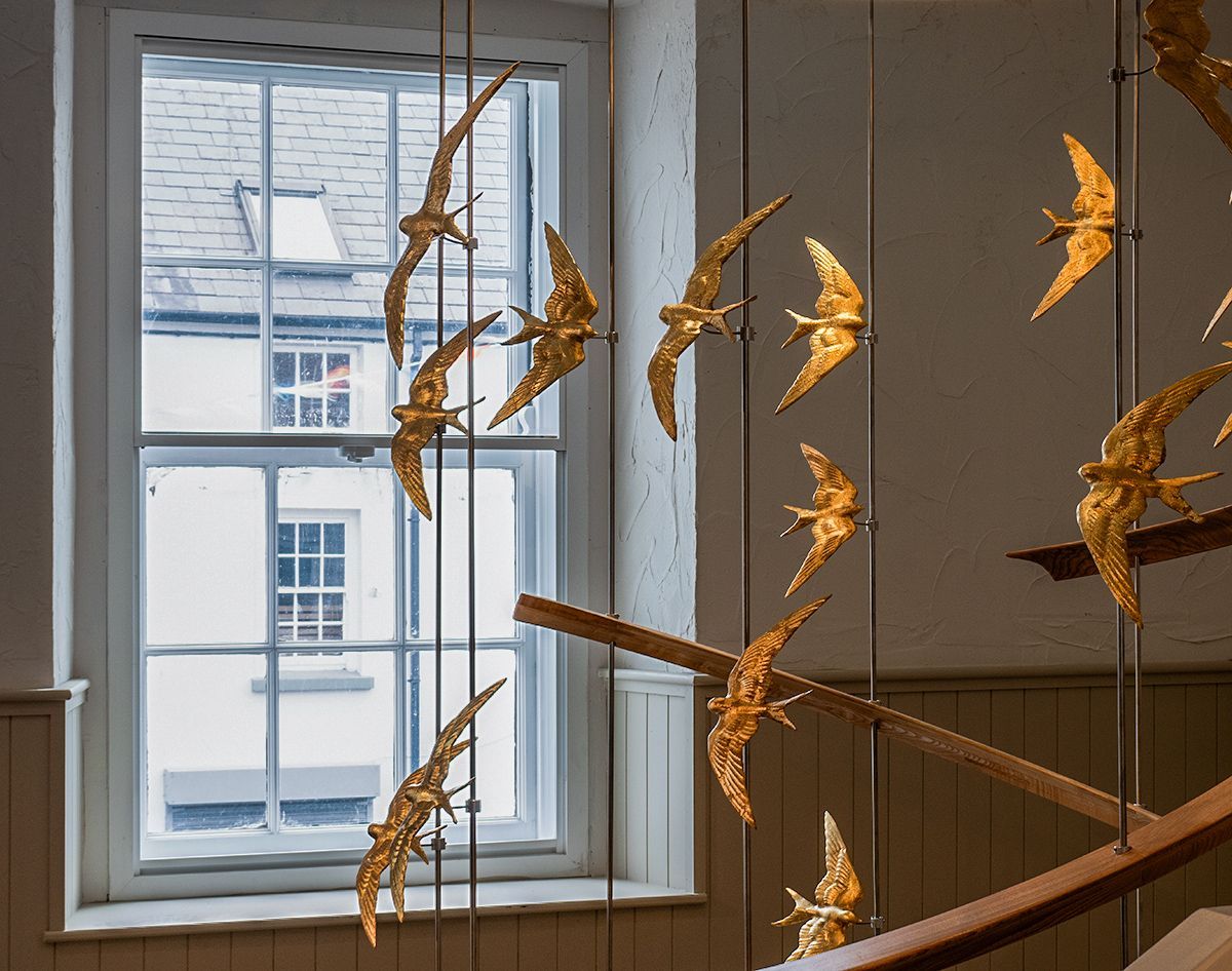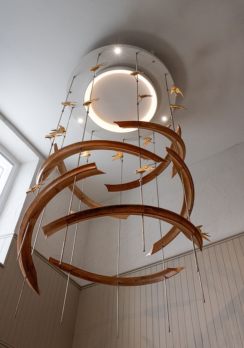 In this sculpture the gold gilded wooden swallows, carved and sourced from local woodlands, display a common unity of purpose. We are directed by the swallow’s glittering upward voltage and pattern of flight, an uplift, towards a revelation of wonder, a type of directional-grace, towards light, and the joy of new beginnings.